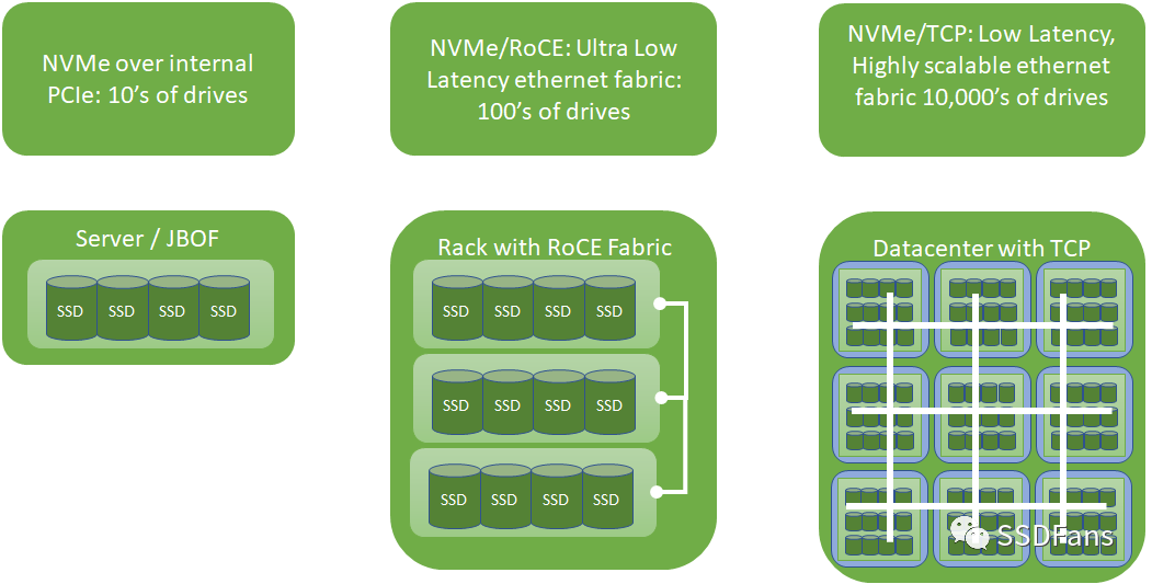 NVMe协议还可以用于PCIe以外的其他传输。例如NVMe over Fabrics(NVMe-oF)。其他类型的NVMe-oF包括基于聚合以太网的RDMA(NVMe / RoCE)和基于光纤通道的NVMe(NVMe / FC)。下图显示了NVMe从成千上万个SSD的演变过程。